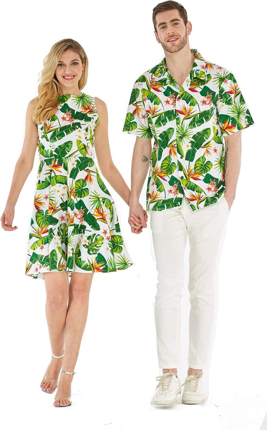 Couple Matching Hawaiian Luau Cruise Outfit Shirt Vintage Dress Classic White(Bird of Paradise White)
