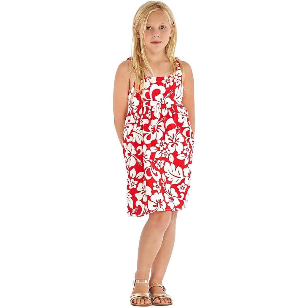 imageGirl Elastic Strap Empire Waist Dress in Classic Hibiscus RedVintage Classic Hibiscus  Green