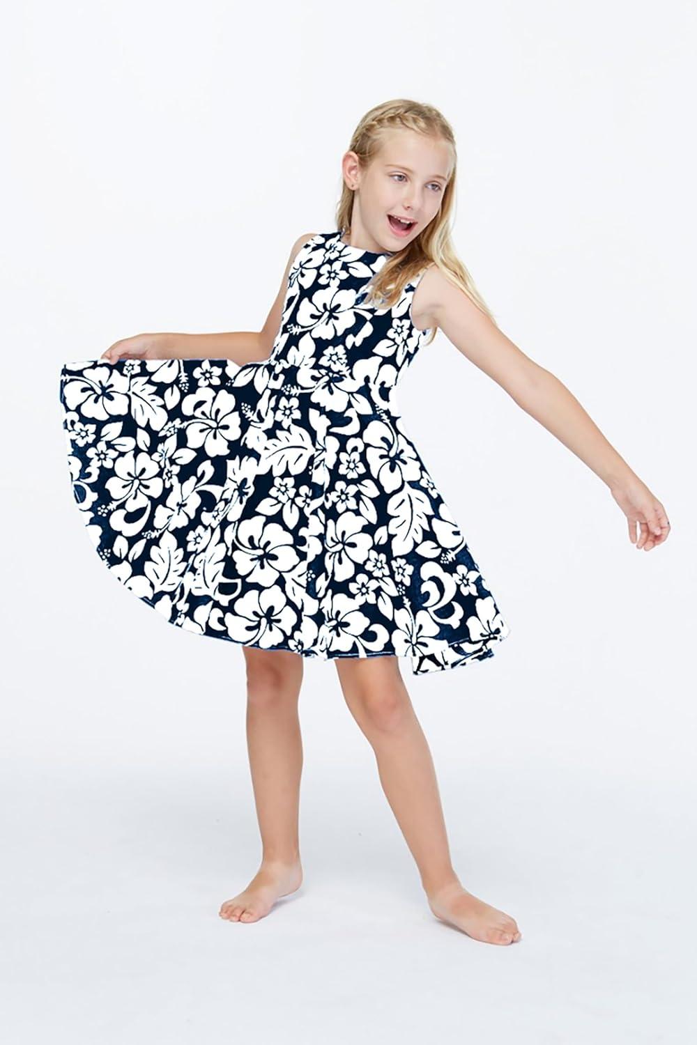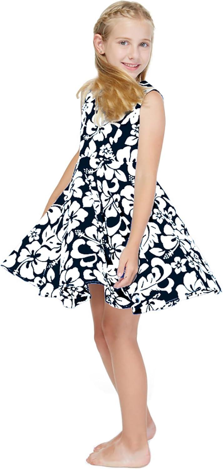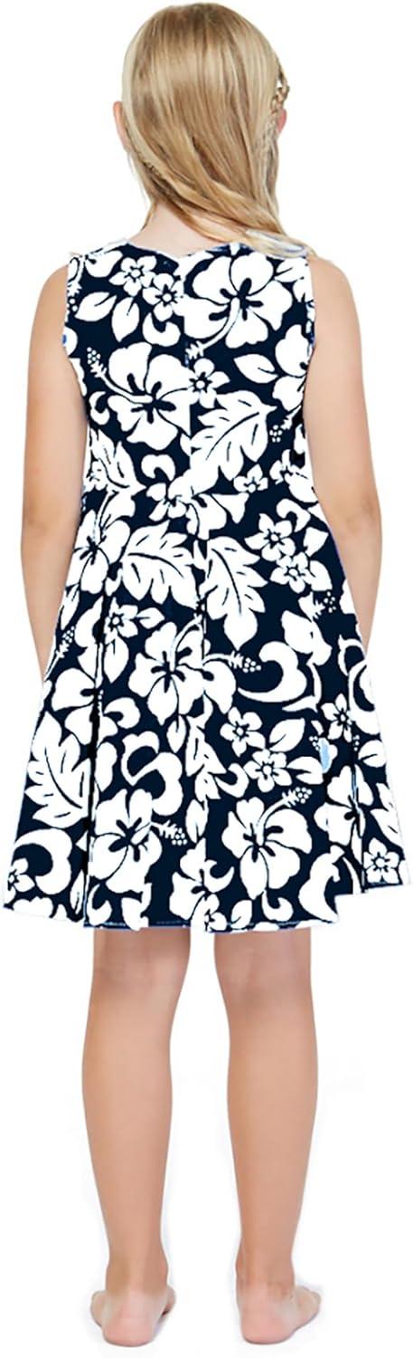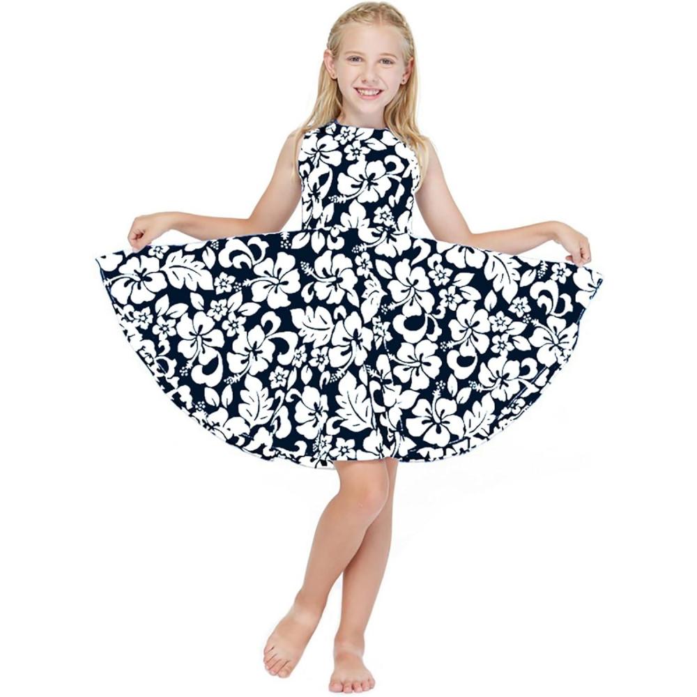 Girl Hawaiian Vintage Fit and Flare Dress in Flamingo in Love(Classic Vintage Hibiscus in Navy)