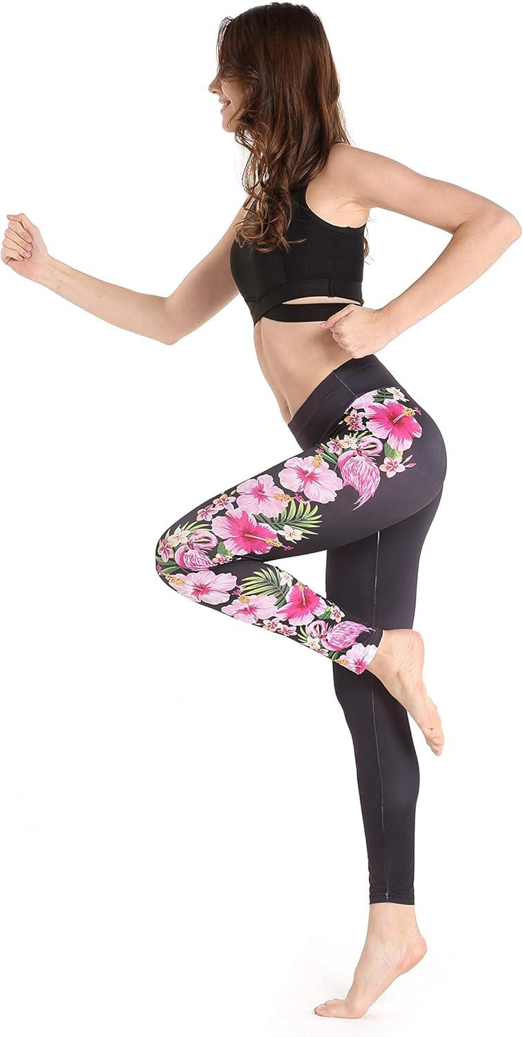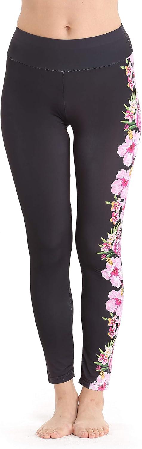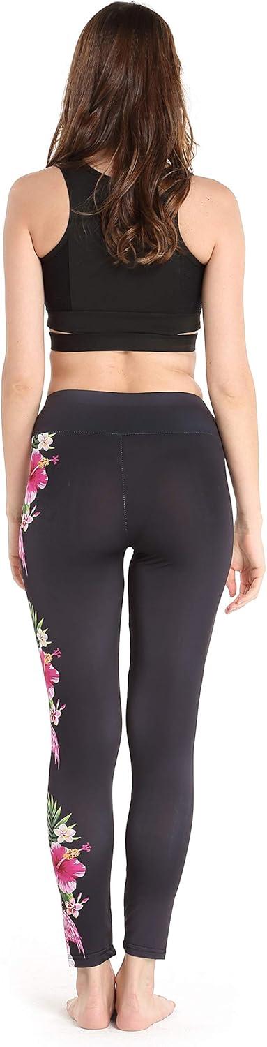 Hawaii Hangover Women’s Tropical Print Performance Yoga Excercise Full Ankle Length Legging in Side Flamingo Floral in Black(Side Flamingo Floral in Black)