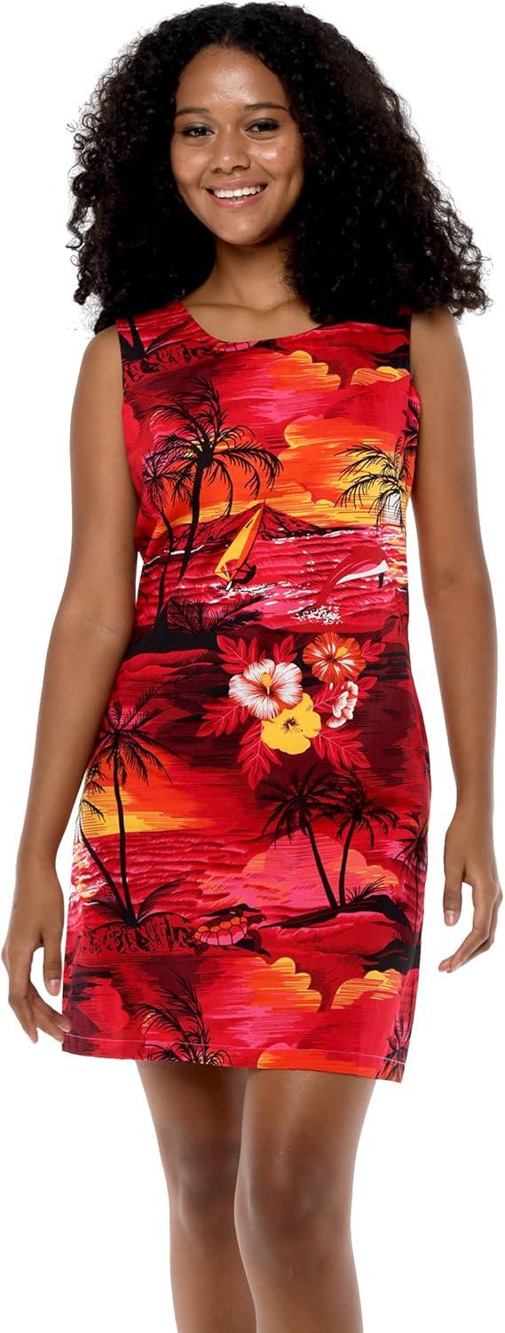 Matchable Couple Hawaiian Luau Men Shirt or Women Tank Dress in Sunset Red(Women Sunset Red)