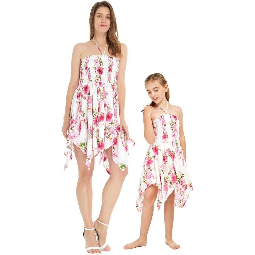 This beautiful Hawaiian print Women and Girl matching outfit is made of rayon, soft and silk-like. Women fairy dress comes in One size. Girl Fairy Dress has an elastic back which makes fitting easy and feels comfortable. Girl's dress comes in size 4-12 Years Old. This pattern also has more styles for men, Women, boys and girls.