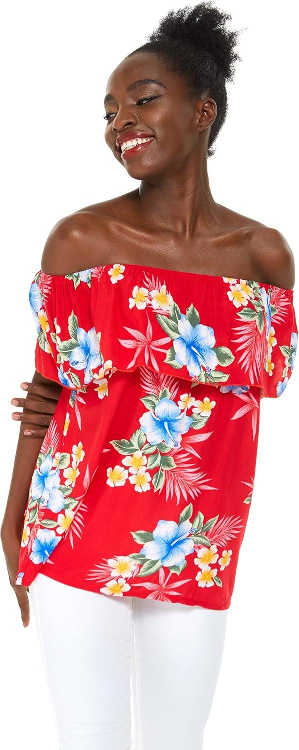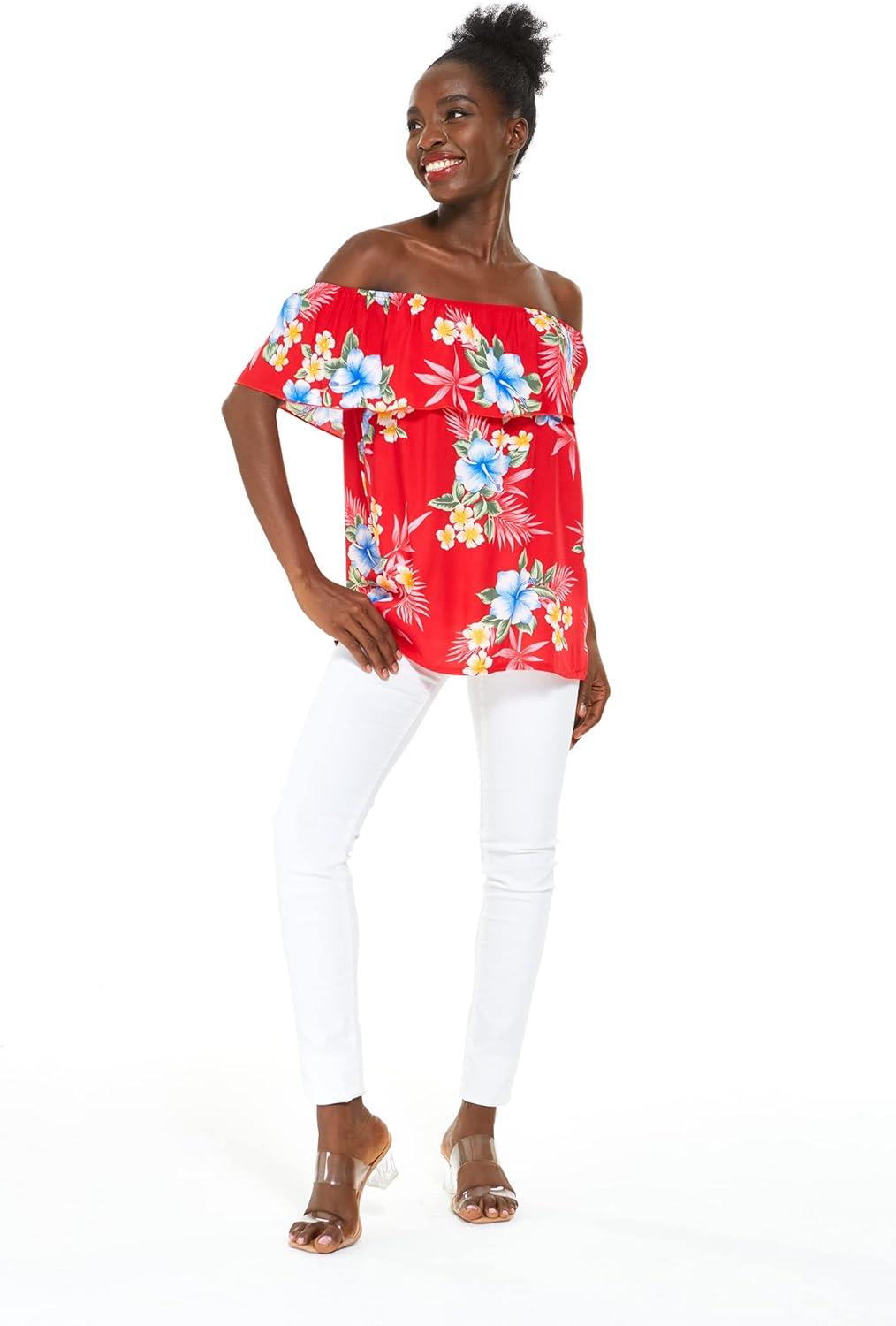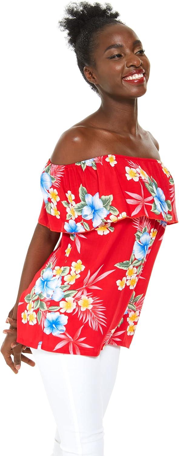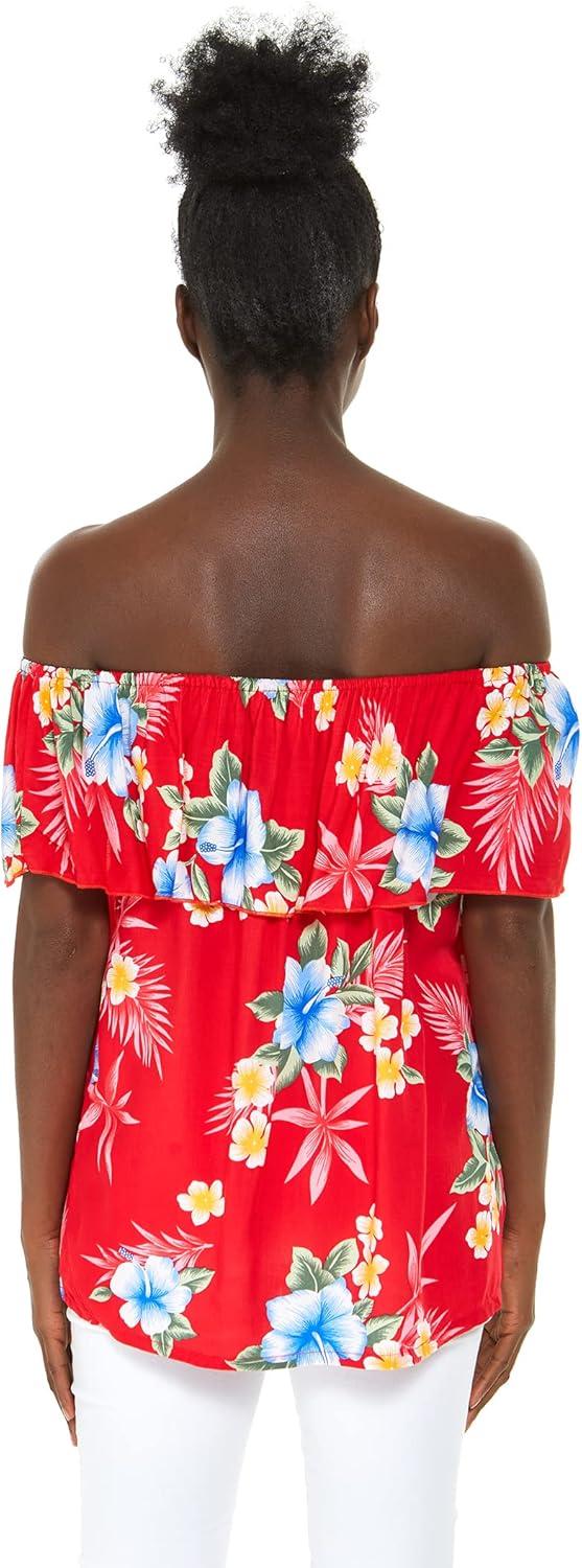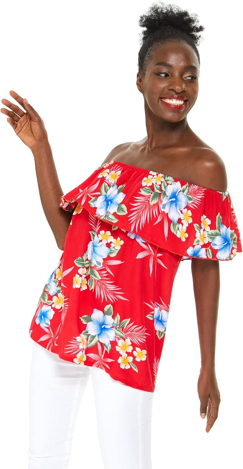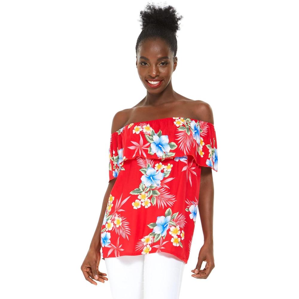 Women’s Hawaiian Off-Shoulder Ruffle Muumuu Top in Pink Hibiscus Vine(Hibiscus Red)
