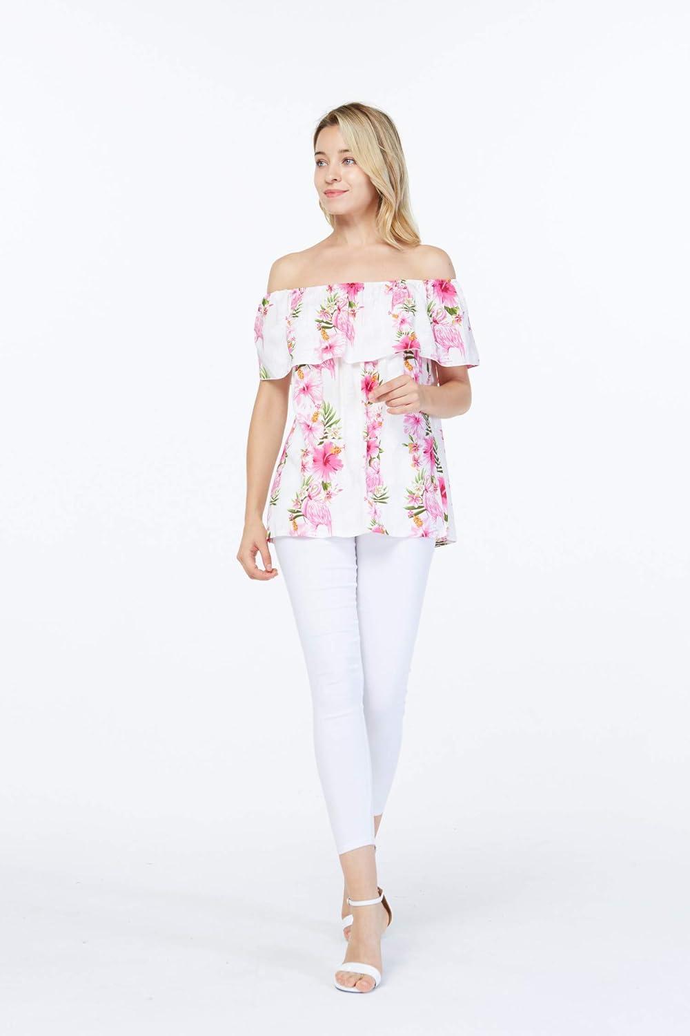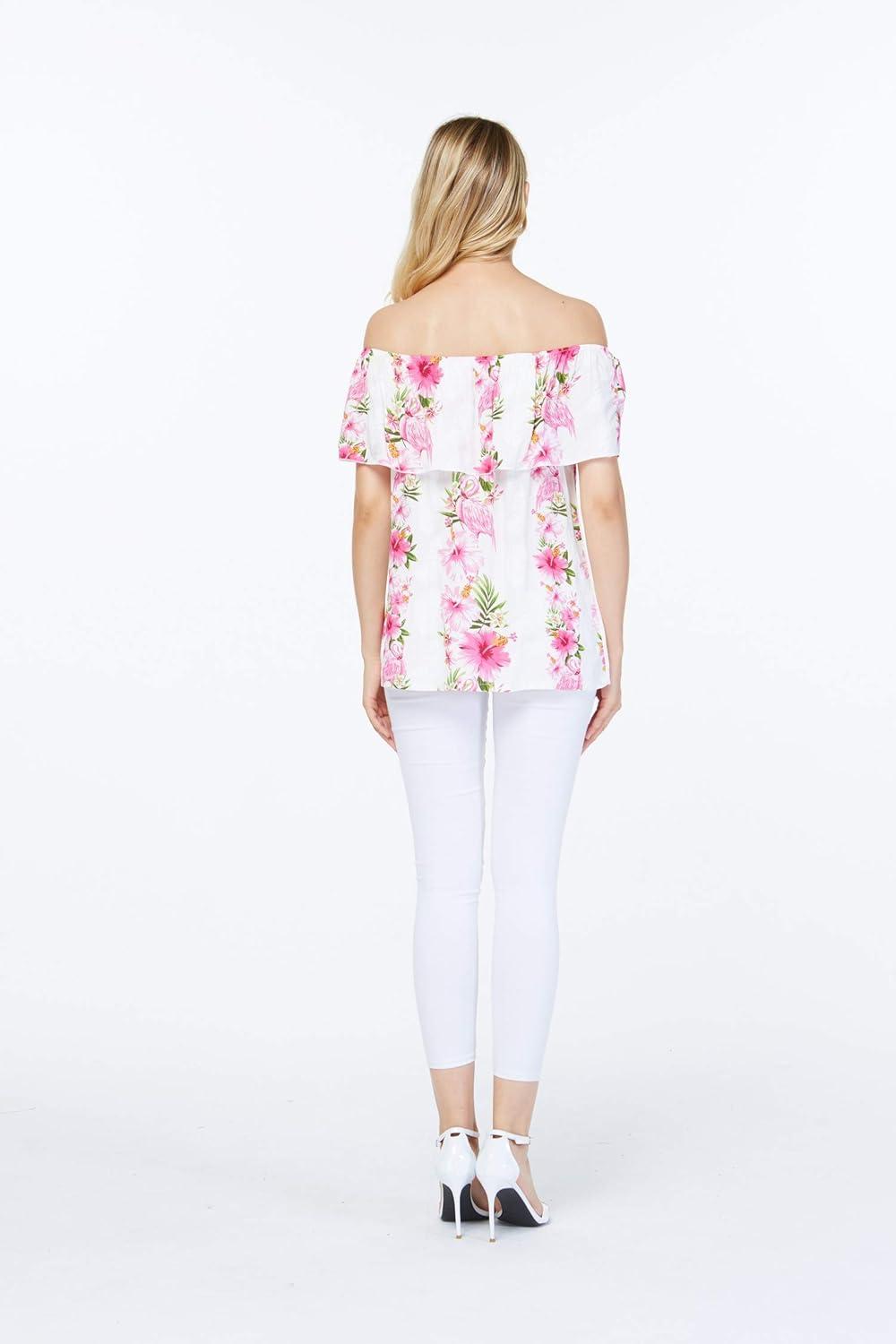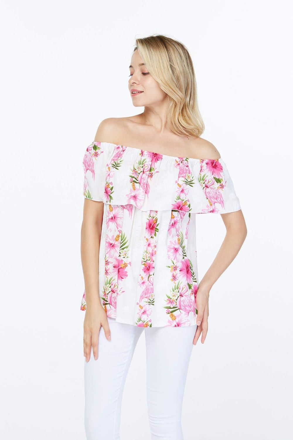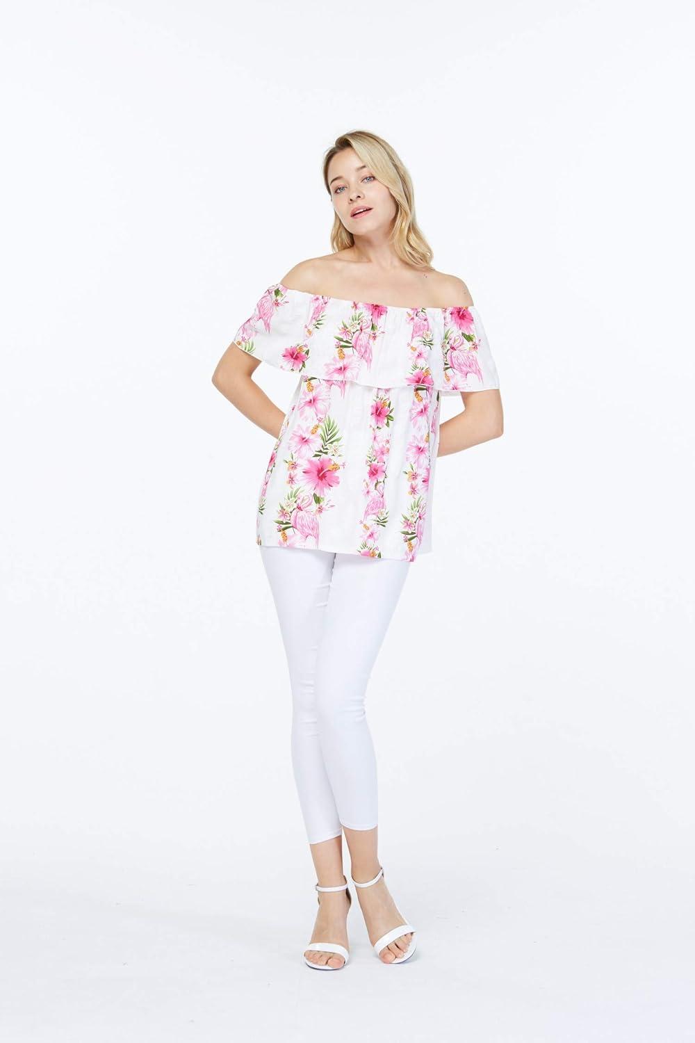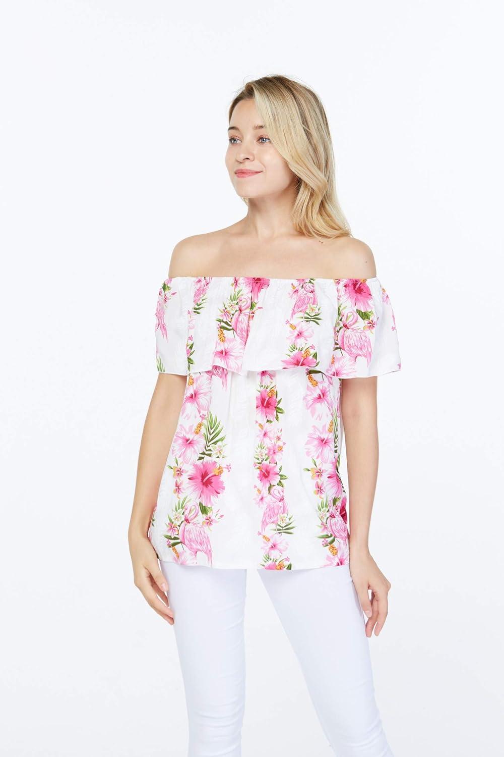 Women’s Hawaiian Off-Shoulder Ruffle Muumuu Top in Pink Hibiscus Vine(Pink Hibiscus Vine)
