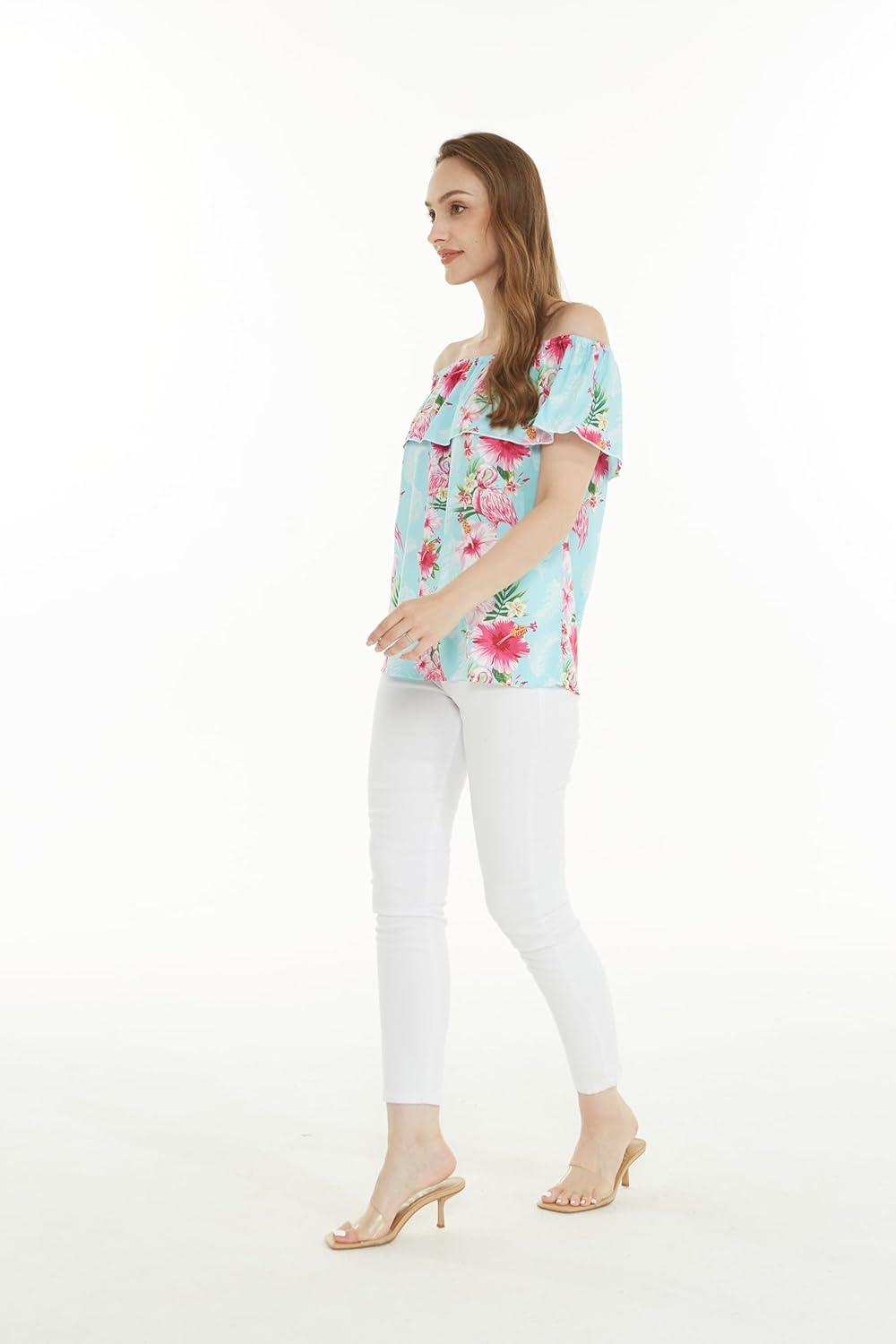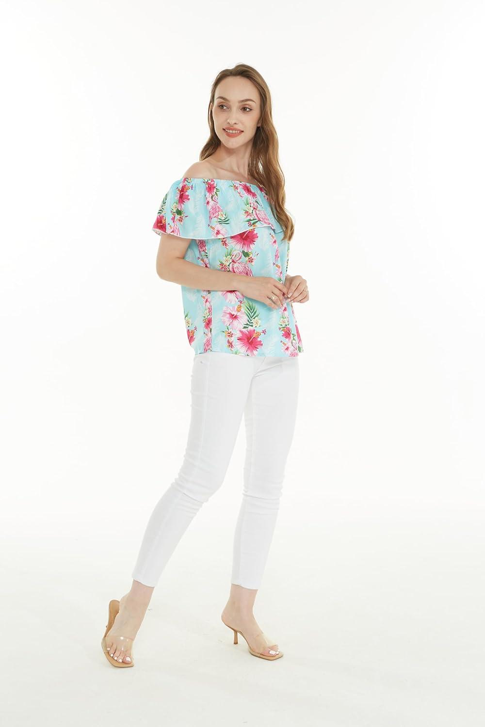 Women’s Hawaiian Off-Shoulder Ruffle Muumuu Top in Pink Hibiscus Vine(Pink Turquoise Hibiscus Vine)