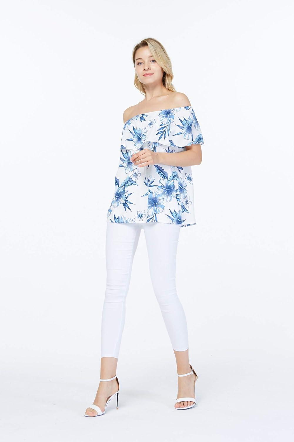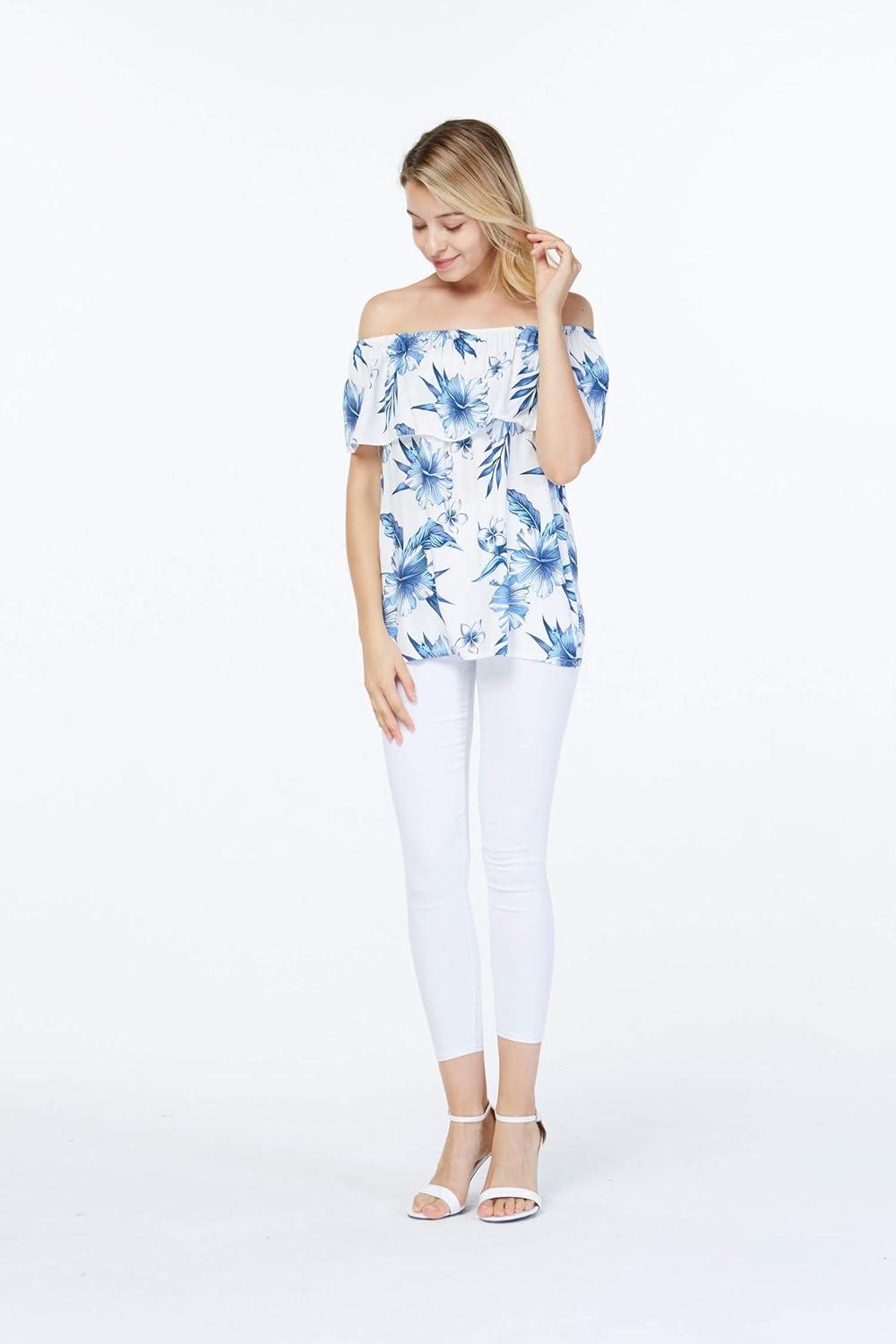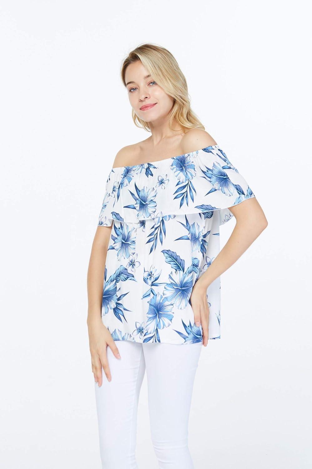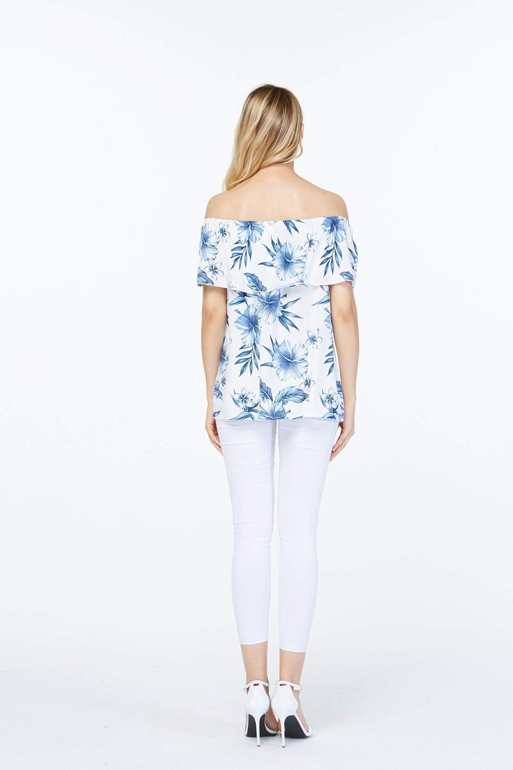 Women’s Hawaiian Off-Shoulder Ruffle Muumuu Top in Tropical Prints(Day Dream Bloom)