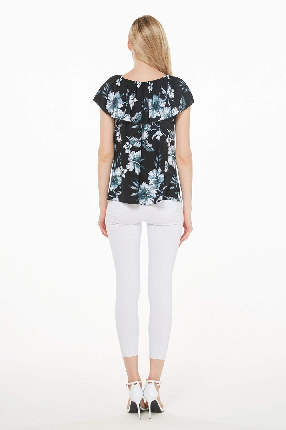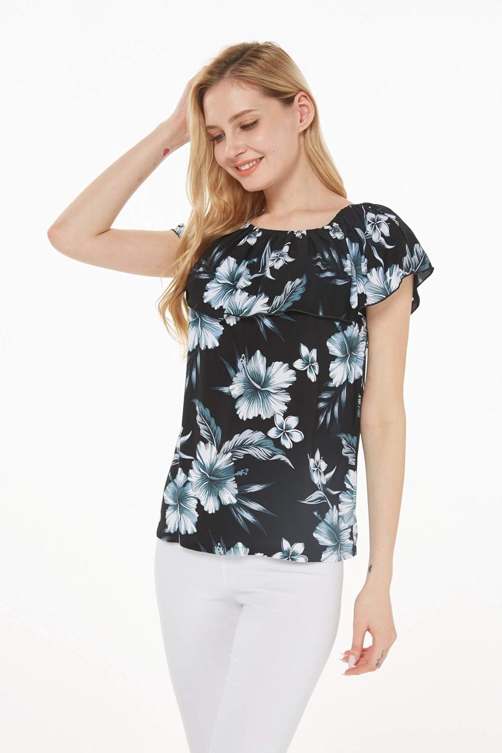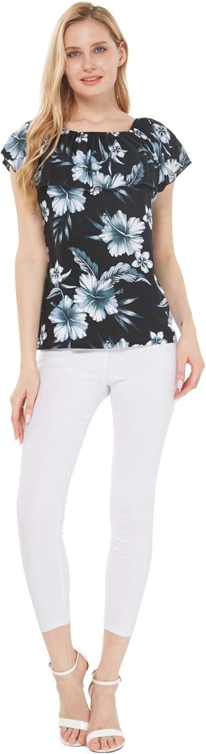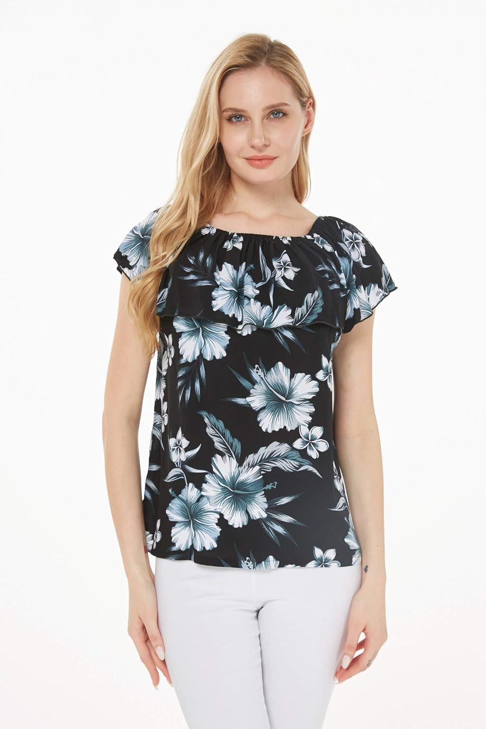 Women’s Hawaiian Off-Shoulder Ruffle Muumuu Top in Tropical Prints(Midnight Bloom)