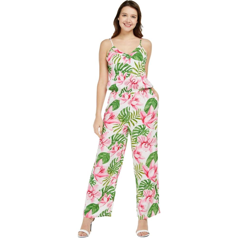 Women’s Hawaiian Strap V with Pockets Jumpsuit in Lotus and Orchid(Misty Lotus White)