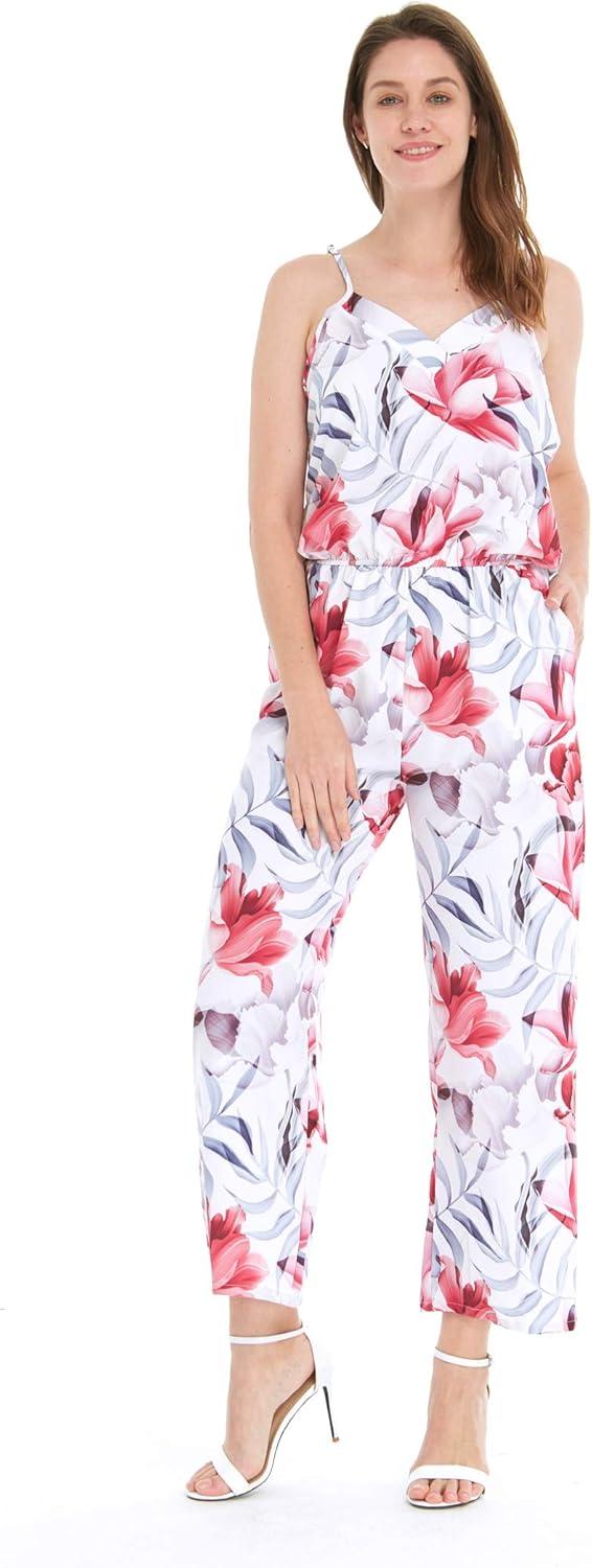 Women’s Hawaiian Strap V with Pockets Jumpsuit in Lotus and Orchid(Tropical Jungle Red)