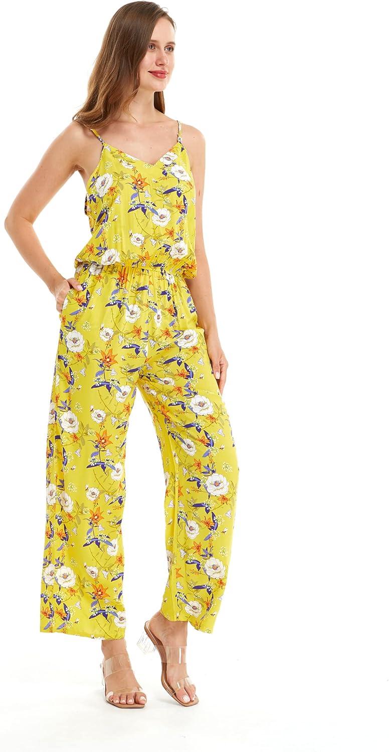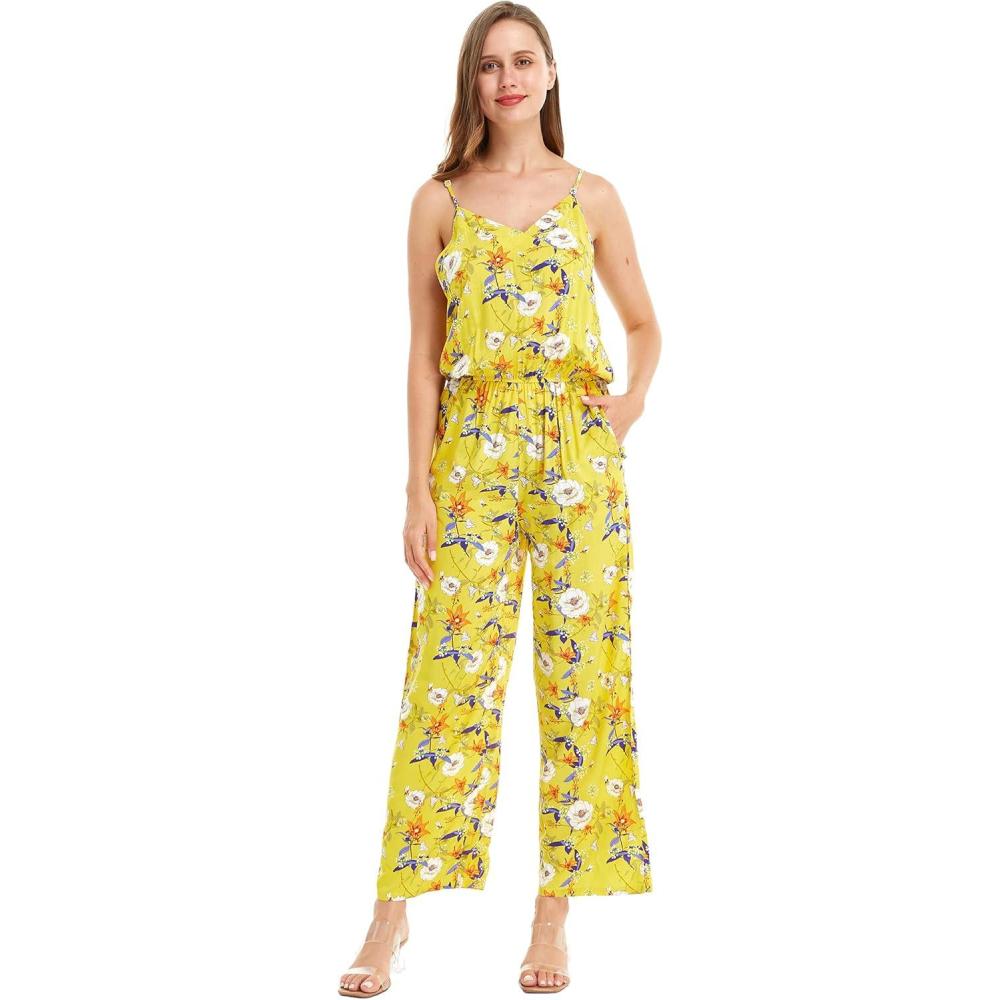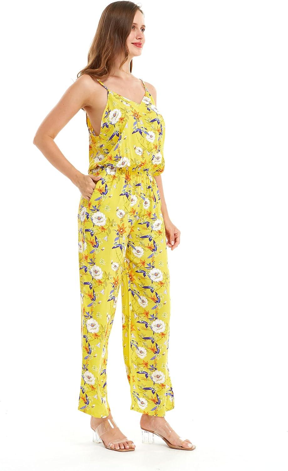 Women’s Hawaiian Strap V with Pockets Jumpsuit in Pink Hibiscus Vine(Garden Poppy Yellow)