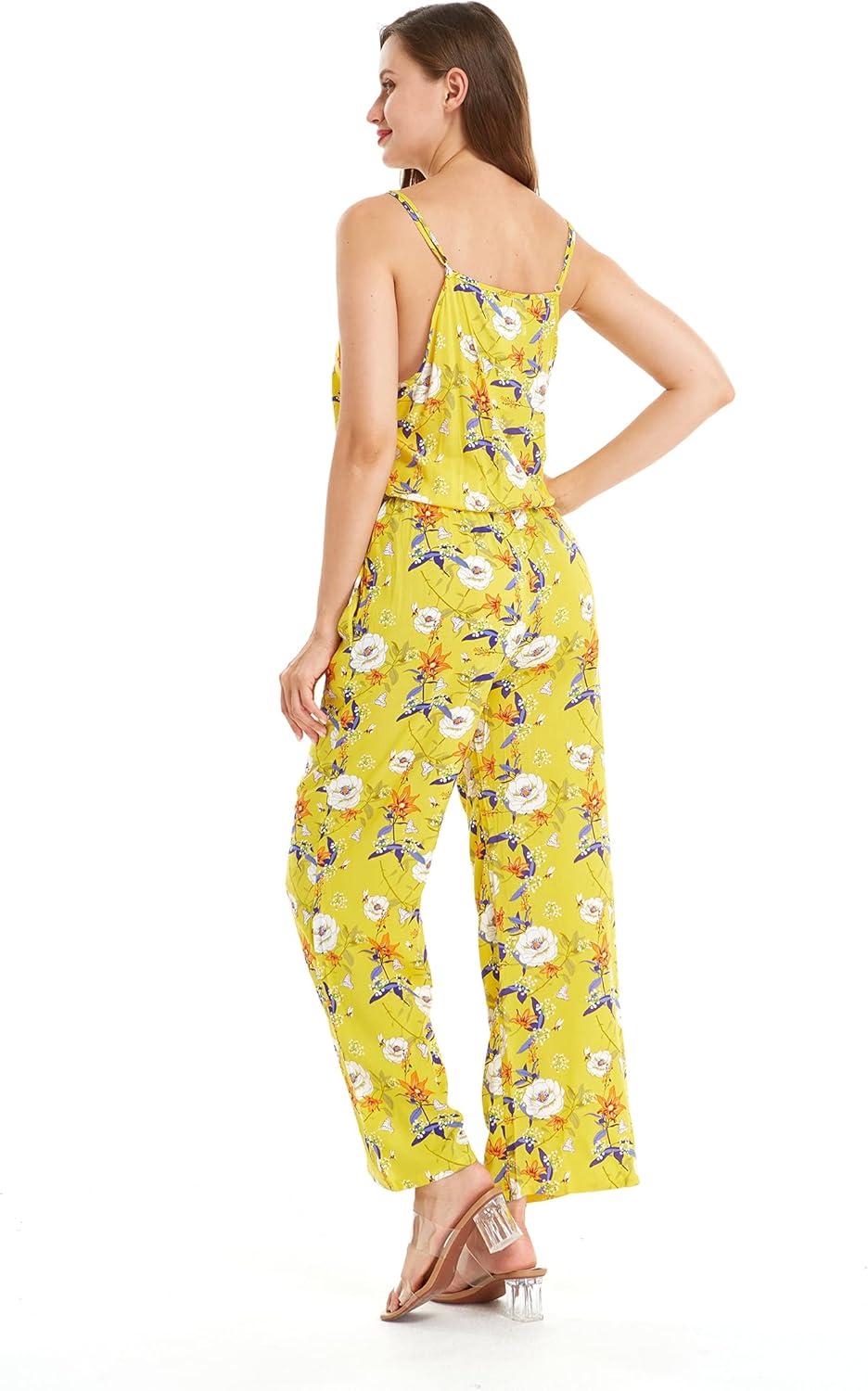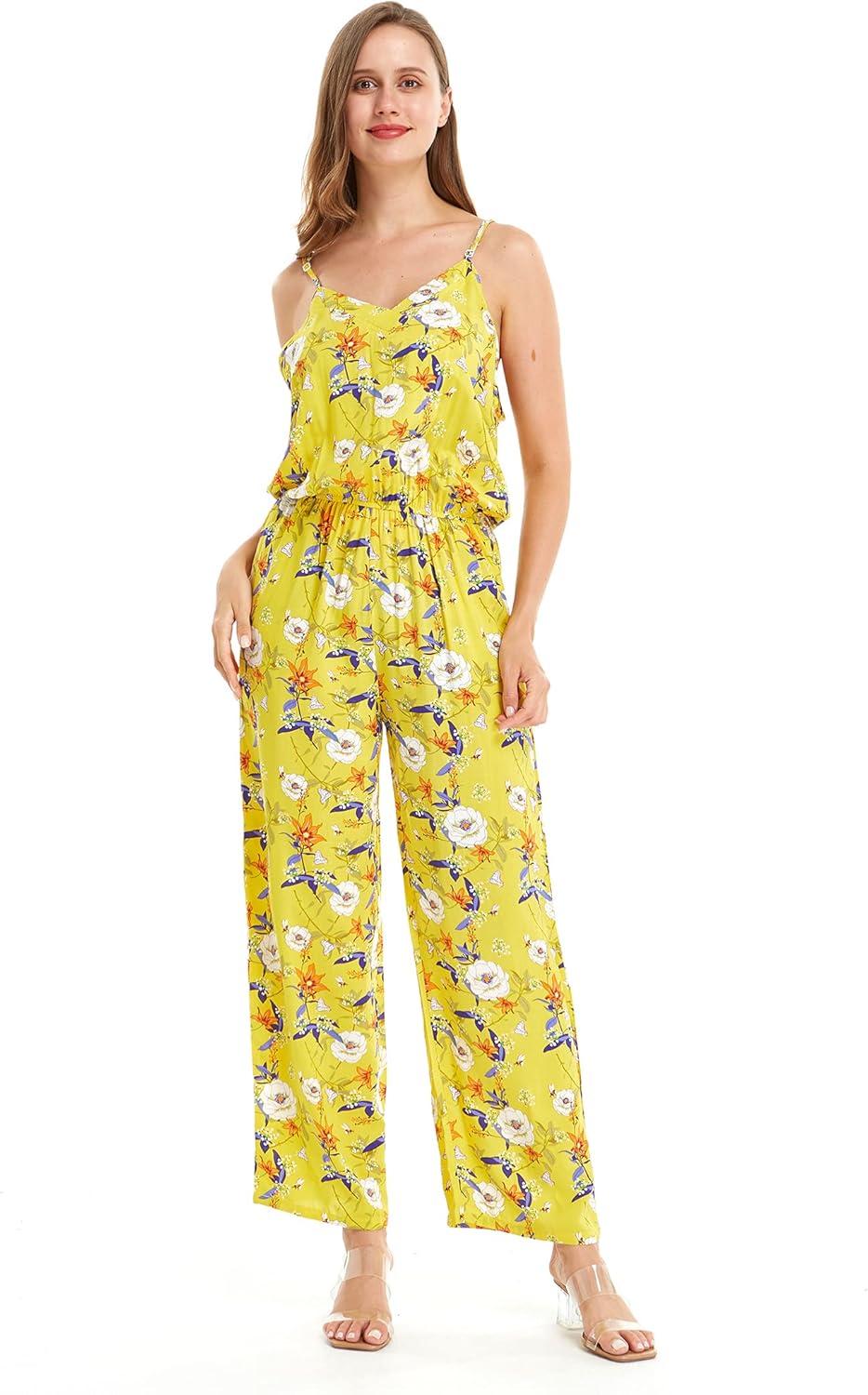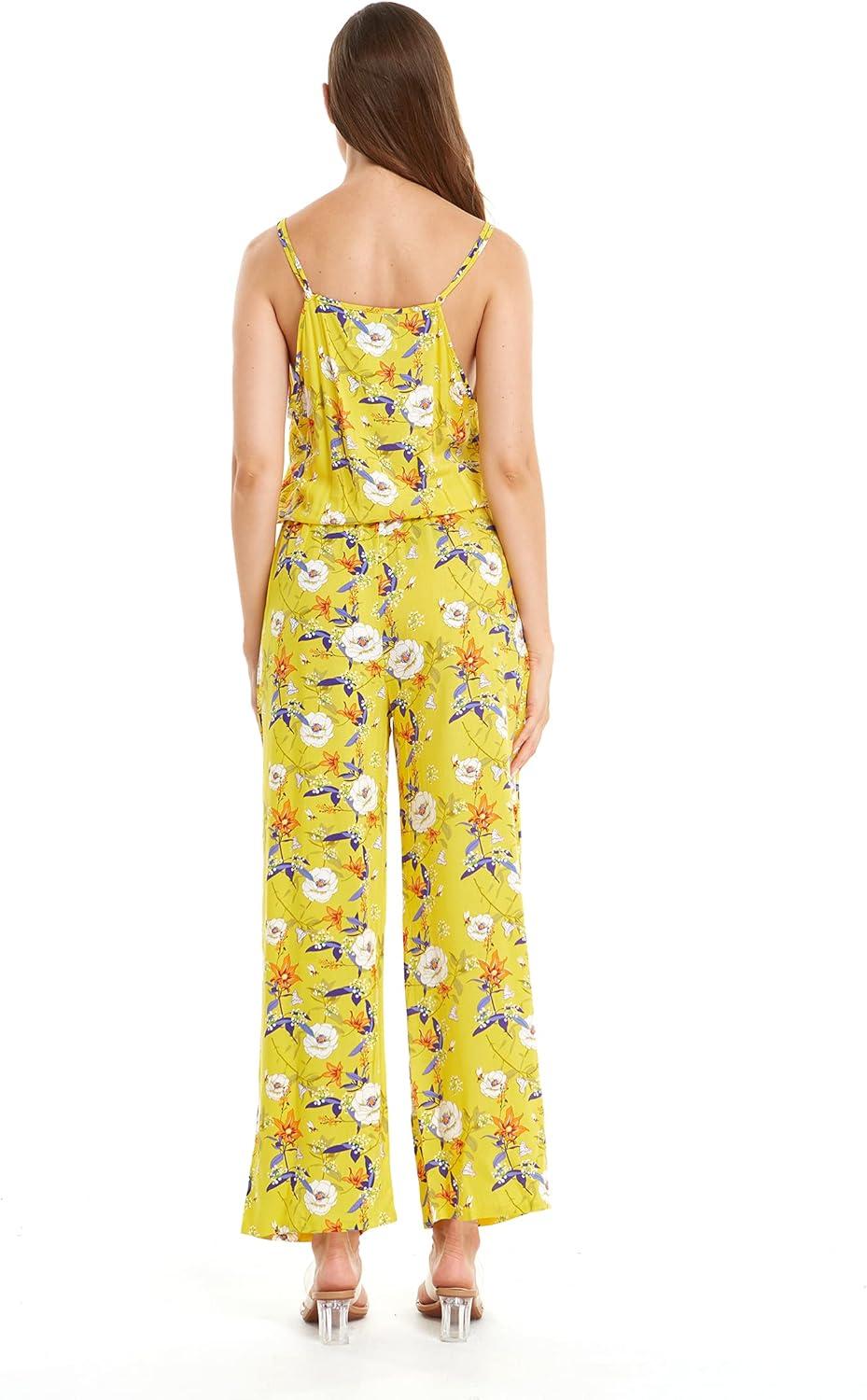 Women’s Hawaiian Strap V with Pockets Jumpsuit in Pink Hibiscus Vine(Garden Poppy Yellow)