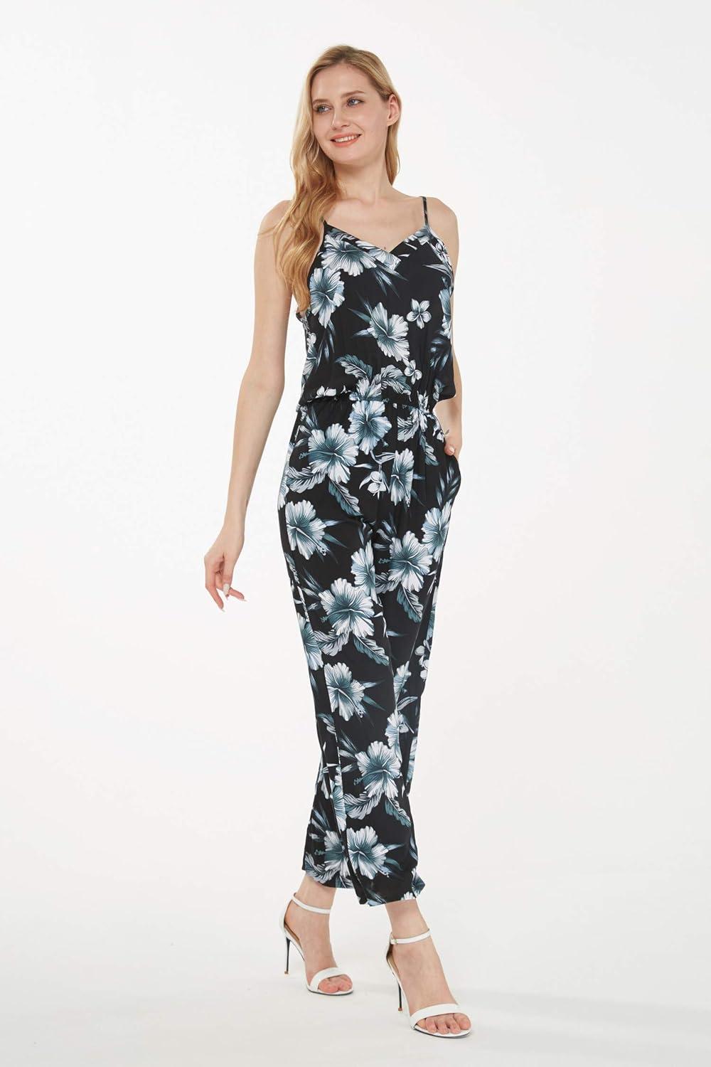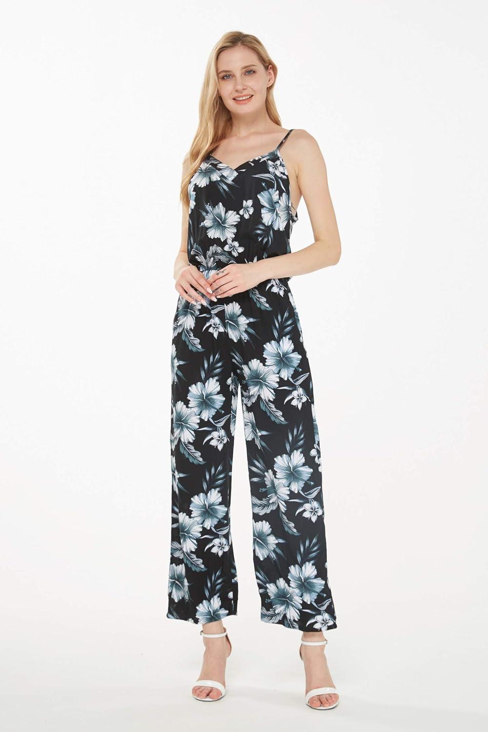 Women’s Hawaiian Strap V with Pockets Jumpsuit in Simply Blue Leaves(Midnight Bloom)